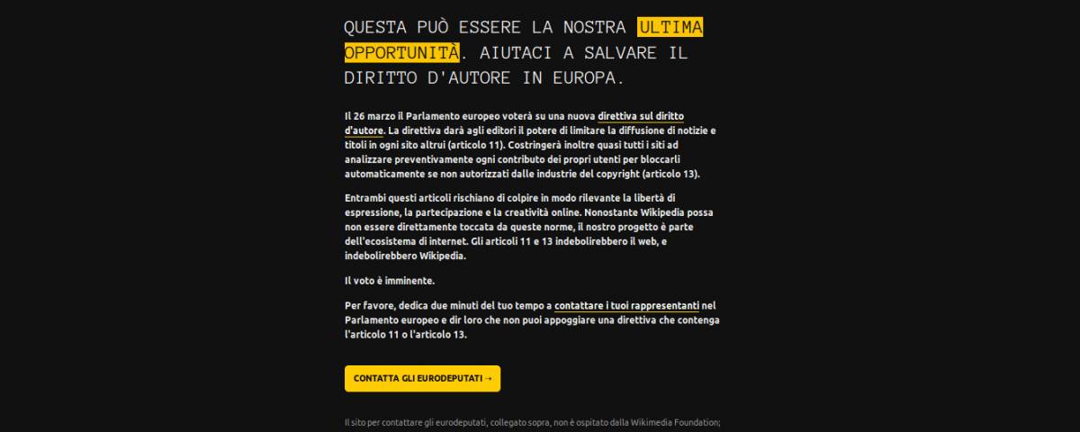Dalle 8.00 di oggi, per 24 ore, le voci di Wikipedia in lingua italiana non saranno accessibili, ma rimanderanno a un banner informativo sulla riforma del diritto d’autore, in vista del voto in plenaria dal Parlamento europeo di domani, martedì 26 marzo.