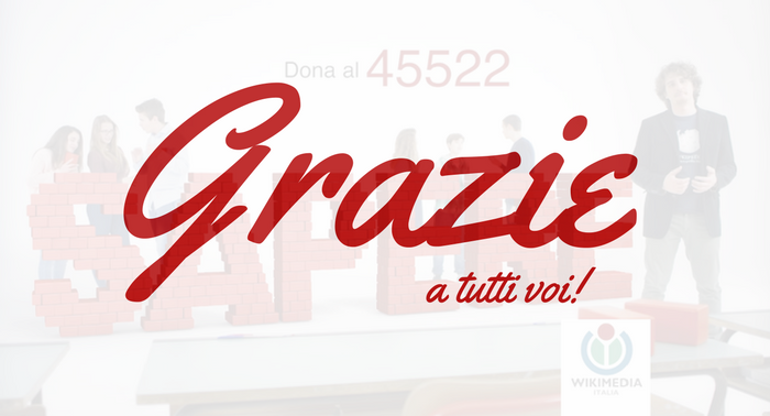 La nostra campagna 2017 con numero solidale si è conclusa questo lunedì, 12 giugno. Il nostro obiettivo: portare l’enciclopedia libera e i progetti Wikimedia nelle classi con il progetto “Wikipedia va a scuola”, per trasmettere ai docenti e agli studenti delle scuole italiane il valore della cultura libera e collaborativa.